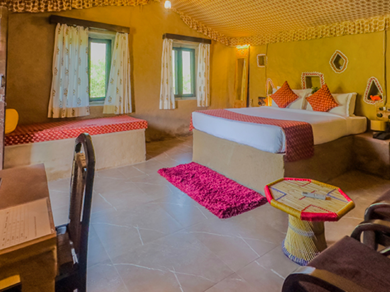 At Chokhiwadi, choose from unique stays: luxury African style tents with Aravalli views, charming mud huts adorned with Mandana art for a rustic vibe, or opulent stone cottages offering royal comfort in the heart of nature.