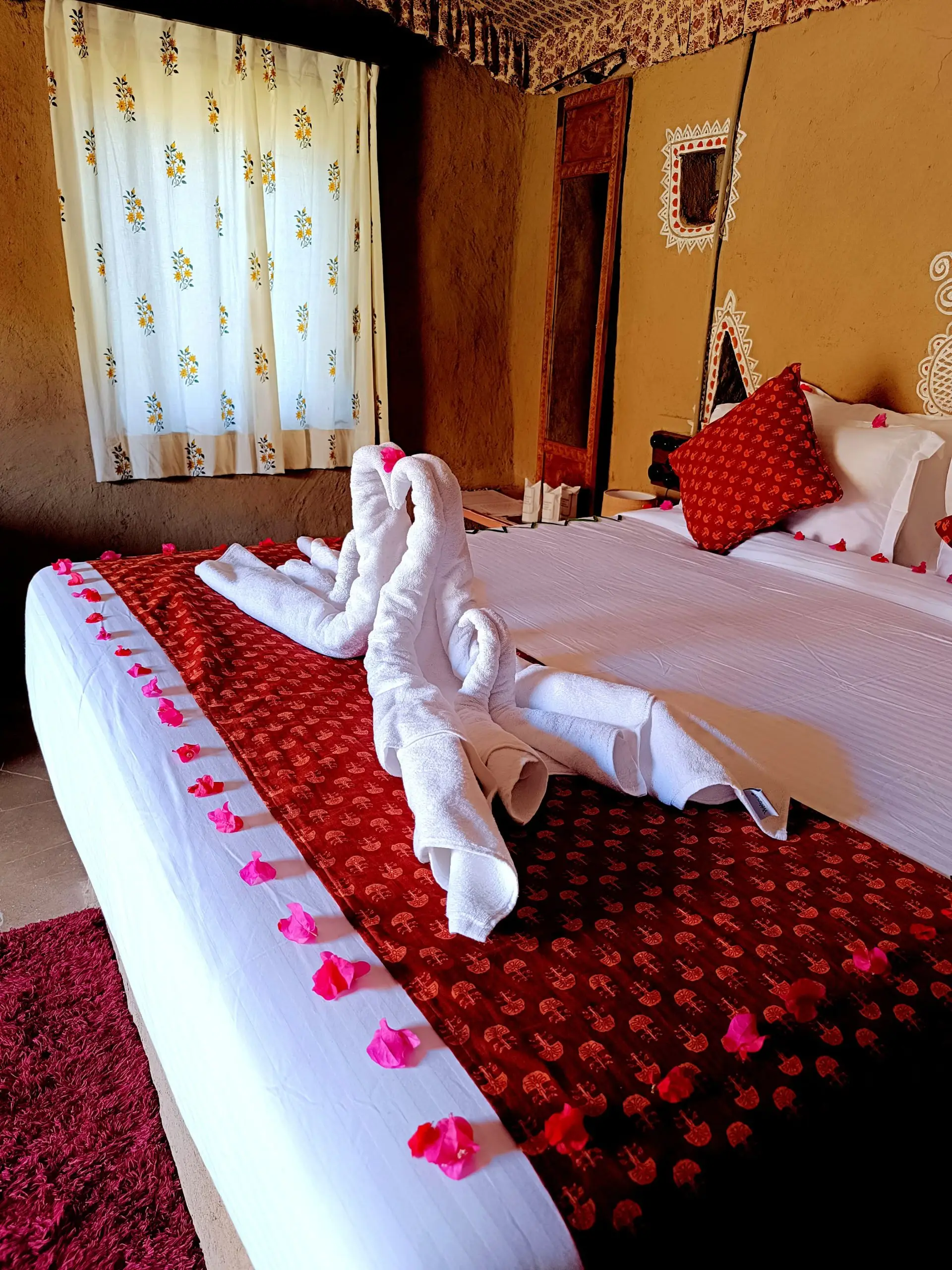 At Chokhiwadi, every stay is a story—lounge in our luxury African tents with porticos that open to Aravalli sunsets and peacock parades, soak in rustic charm inside hand-painted Mandana mud huts that whisper village tales, or live it up like royalty in our opulent stone cottages, where wild meets regal in the most indulgent way